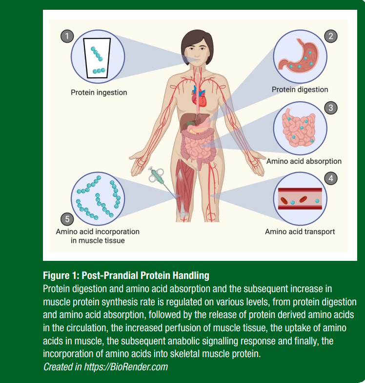 Regulation of post-prandial protein metabolism on a whole-body level is complex (Groen et al., 2015). The increase in muscle protein synthesis following protein ingestion is regulated at multiple levels, beginning with the ingestion of protein and its subsequent digestion and the absorption of the protein-derived amino acids. The greater part of those protein-derived amino acids will be released into the circulation. Whether these amino acids will reach the muscle will depend on the hormonal response to the ingested meal. The post-prandial release of insulin will stimulate the perfusion of the insulin sensitive tissues, including skeletal muscle. The circulating amino acids will subsequently be delivered to muscle tissue, where they will activate the signalling pathways involved in muscle protein synthesis. The stimulation of the anabolic signalling cascade, combined with an adequate supply of essential as well as non-essential amino acids, will then support the post-prandial rise in muscle protein synthesis rates. This coordinated response highlights the critical role of nutrition and metabolic regulation in maintaining and improving skeletal muscle health. These processes can be studied using stable isotope-labeled amino acids. By administrating labeled amino acids and tracking their incorporation into muscle tissue protein, muscle protein synthesis rates can be directly measured. However, this only provides insight into the process of muscle protein synthesis.