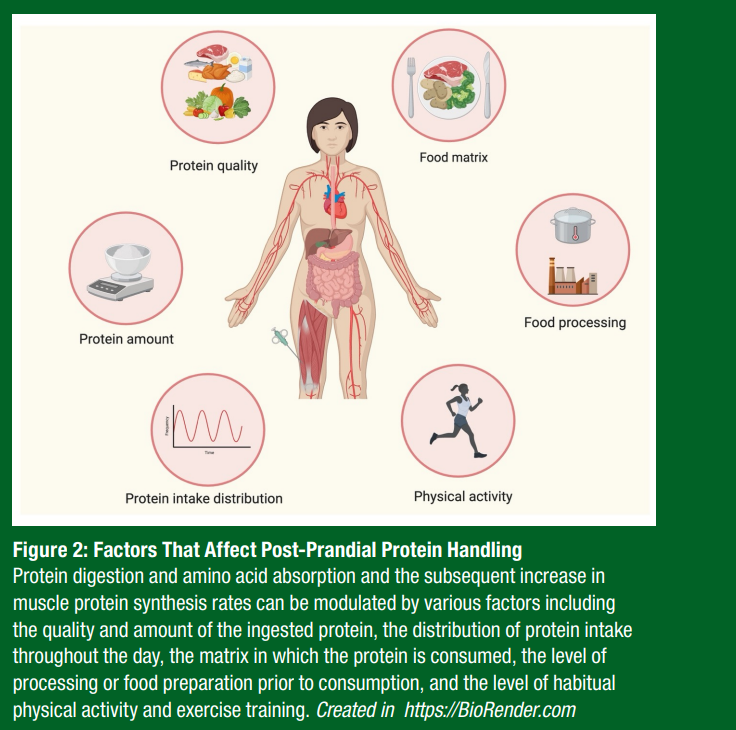 Protein digestion and amino acid absorption are not only influenced by the type and amount of the protein isolate or concentrate, but also by the matrix in which the protein is being consumed. The food matrix encompasses the structural and compositional properties of a food product or a mixed meal. These properties are defined by the presence of other macro- and micronutrients, fibers, (other) anti-nutritional factors, as well as the form of the food(s) and how they have been processed or prepared. Processing, whether industrial or home-based, can strongly impact the bioavailability of the protein-derived amino acids (Weaver, 2021). For example, minced meat is digested more rapidly than a steak (Pennings et al., 2013), and amino acids derived from raw eggs are absorbed less efficiently than cooked eggs (Fuchs et al., 2022). Whereas cooking can improve more rapid protein digestion and amino acid absorption, heating dairy can also have less favourable impact. Recently, it was shown that heating milk protein can lead to glycation, reducing the capacity to absorb the available lysine (van Lieshout et al., 2025). These findings underline that the context in which we consume protein, liquid vs solid, raw vs cooked, isolated vs whole food, protein source vs mixed meal, etc., all impact post-prandial protein handling and, as such, modulate the metabolic fate of the ingested protein-derived amino acids. So far, most research on post-prandial protein handling has assessed protein digestion, amino acid absorption and/ or muscle protein synthesis rates after ingestion of protein isolates or concentrates following an overnight fast. However, this is certainly not reflective of daily living conditions in which we typically consume various complex meals throughout the day(s). Furthermore, the way we consume meals, including factors such as chewing and swallowing and even the position in which we eat, all affect the protein digestion and amino acid absorption kinetics (Holwerda et al., 2016; Remond et al., 2007). This real world complexity is difficult to replicate in a laboratory setting and, therefore, more work is needed to start understanding how proteins behave in the context of complex meals, with inclusion of meal to meal (and protein supplement) interactions.