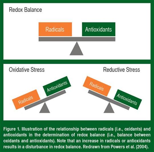 The balance between antioxidants and oxidants is commonly referred to as “redox balance” and is illustrated in Figure 1. Oxidative stress results from an imbalance between antioxidants and oxidants (i.e., radicals); this occurs when oxidant production exceeds the antioxidant capacity (Figure 1). In contrast, reductive stress occurs when the antioxidant capacity greatly exceeds the rate of oxidant (i.e., radical production).
