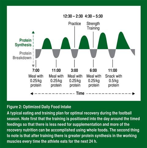 Beyond the basic ideas as to how leucine-rich foods and mTORC1 are good for optimizing protein balance and recovery during a football season, the precise quantity and timing of protein intake is known as well. In order to maximize protein synthesis, an athlete should consume 0.25 g/kg body mass of leucine-rich protein immediately after training (Moore et al., 2009) and every ~4 h throughout the day. This amount is selected because taking in more protein does not result in any further increase in muscle protein synthesis. This also means taking more protein less often cannot compensate for regularly spaced meals each containing the optimal amount of protein (Areta et al., 2013); (Figure 2).